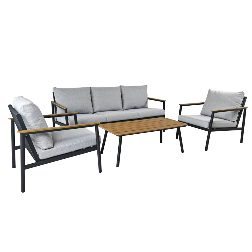 4-osaline alumiiniumist aiamööblikomplekt LAUREL ühendab modernse disaini, vastupidavad materjalid ja mugavad istmepadjad, luues stiilse ja praktilise lahenduse terrassile, rõdule või aeda. Kerged, kuid tugevad raamid ning kaetud käetoed muudavad komplekti kasutamise mugavaks, samal ajal kui köiega punutud seljatugi lisab visuaalset pehmust ja kaasaegsust. 10 cm paksused padjad tagavad mõnusa istumismugavuse nii lühikeste kohvipauside kui ka pikkade õhtute jaoks.