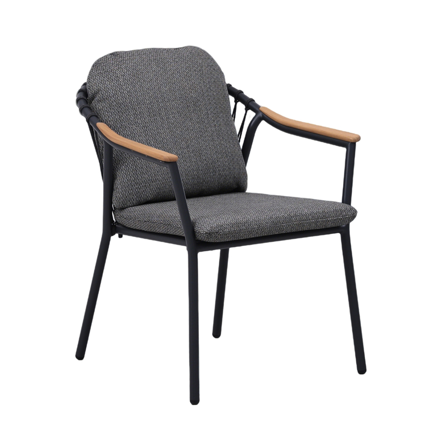 DIEM aiatool ühendab kaasaegse tumehalli metallraami, pehme köisviimistluse ja naturaalsed tiikpuidust käetoed. Tulemuseks on mugav ja visuaalselt soe tool, mis sobib suurepäraselt nii terrassile kui aeda.