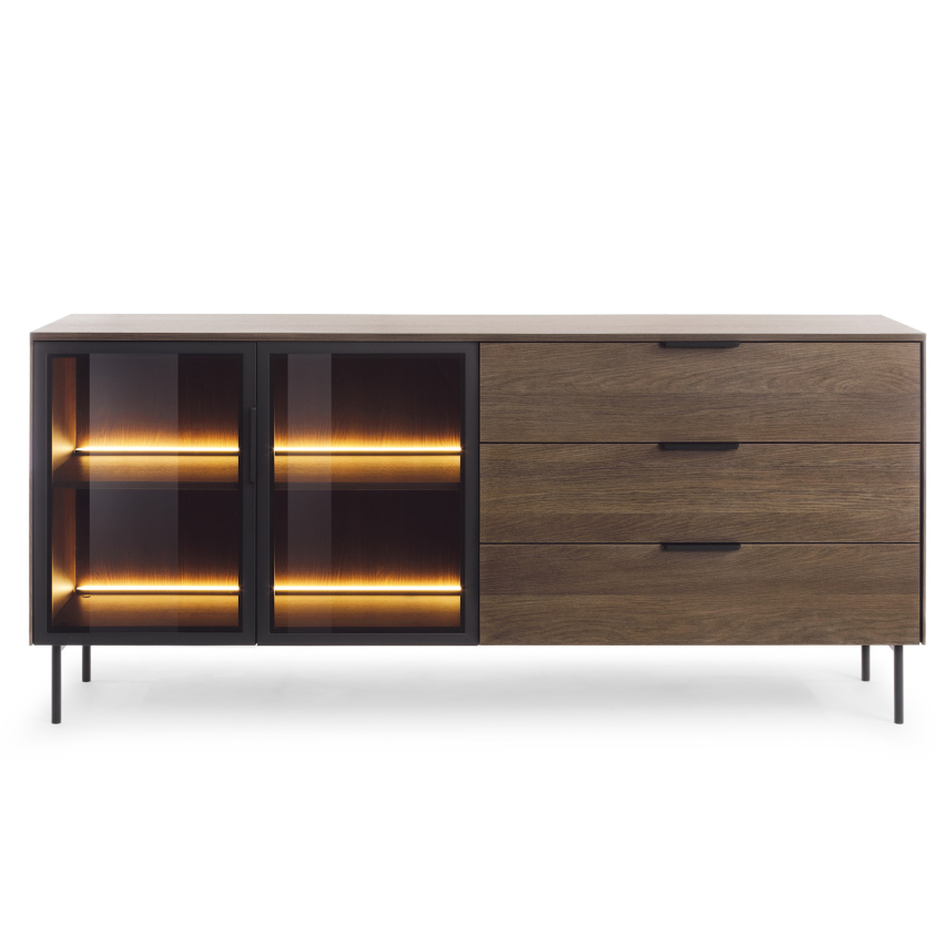 LUMI kummut Dunin tammes ühendab endas modernse elegantsi ja praktilise funktsionaalsuse. Klaasustega vitriinosa koos sooja LED-valgustusega loob hubase ja pilkupüüdva atmosfääri, samal ajal kui mahukad sahtlid pakuvad mugavat panipaika igapäevastele esemetele. Naturaalne tammetoon ja mustad detailid annavad mööblile kaasaegse ning iseloomuka ilme.