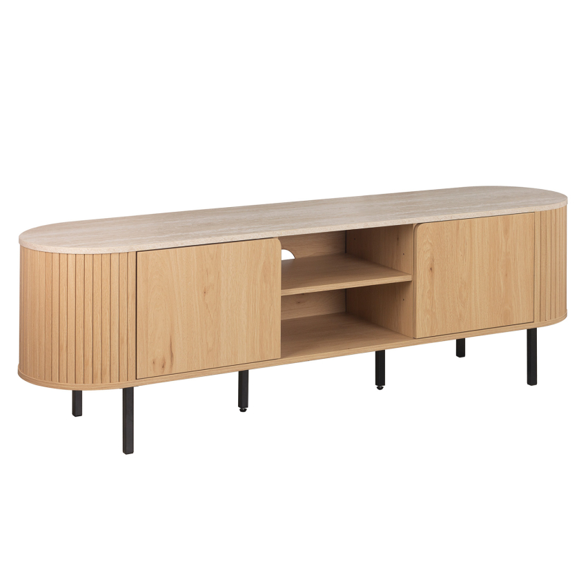 TV-laud FABIA mõjub rahuliku ja tasakaalukana. Travertiini tooni pealispind koos tamme viimistlusega loob looduslähedase üldmulje, mida täiendavad pehmelt ümardatud otsad ja ribilised detailid. Mustad metalljalad lisavad kontrasti ning annavad mööblile õhulise ilme.