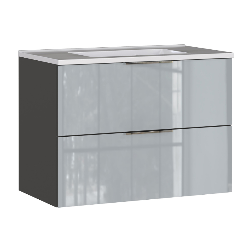 VASIO valamukapp ühendab kaasaegse disaini ja kvaliteetse igapäevakasutuse. Tumehall korpus ja hõbehallid klaasesipaneelid loovad elegantse ja helge mulje, mida täiendavad kroomitud metallservaga käepidemed. Täielikult väljatõmmatavad sahtlid sulguvad vaikselt ja sujuvalt tänu integreeritud sulgumismehhanismile, tagades mugava ja kestva kasutuskogemuse. Komplekti täiendab klassikaline valge keraamiline valamu.
