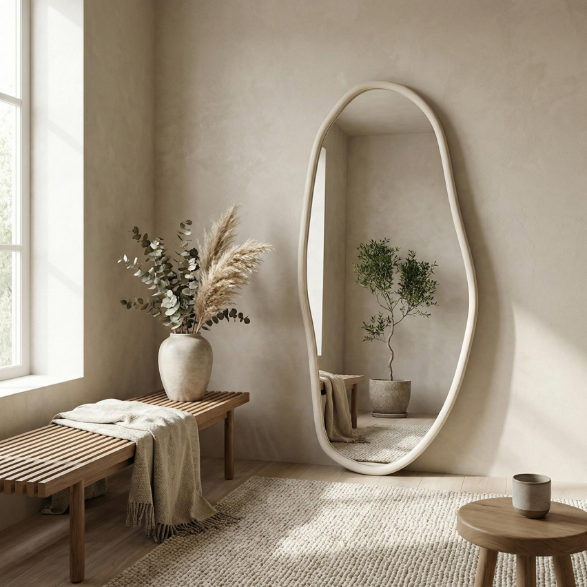 Orgaanilise ja voolava kujuga seinapeegel, mis pehmendab ruumi üldmuljet ja lisab interjöörile kaasaegset iseloomu. Asümmeetriline vorm mõjub loomulikult ning sobib hästi elutuppa, magamistuppa või esikusse.
