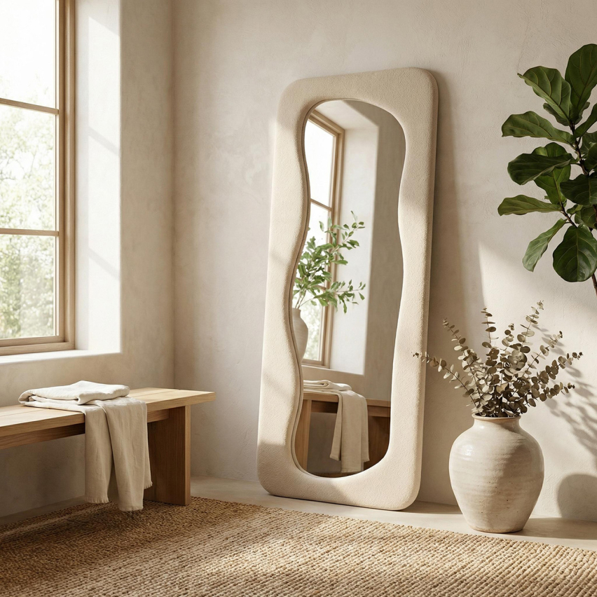 KIMONO peegel pehme ja voolava kujuga täiskõrguses peegel, mis mõjub ruumis pilkupüüdva ning eristuva sisustuselemendina. Laineline vorm ja pehme raam annavad peeglile hubase ning modernse ilme, sobides hästi magamistuppa, garderoobi või esikusse.