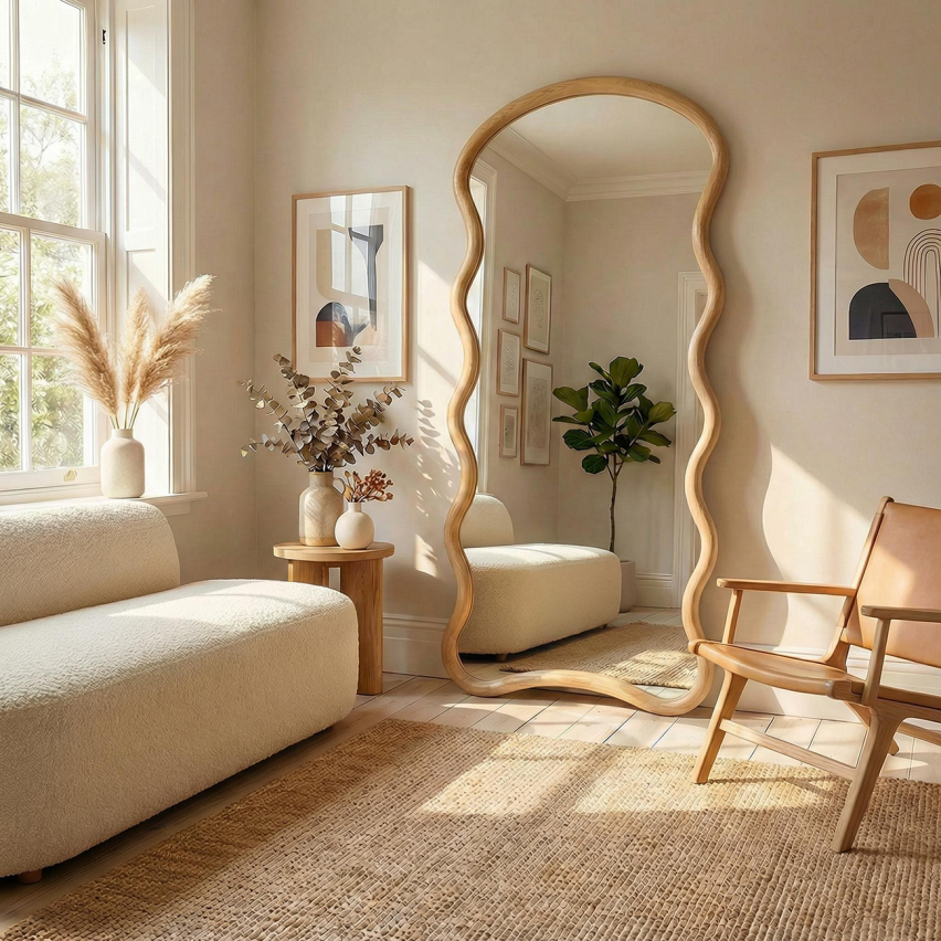 Voolava ja orgaanilise vormiga täiskõrguses seinapeegel, mis lisab ruumile pehmust ja isikupära. Laineline raam toob interjööri rahuliku, kuid pilkupüüdva aktsendi ning sobib hästi nii magamistuppa, esikusse kui ka elutuppa.