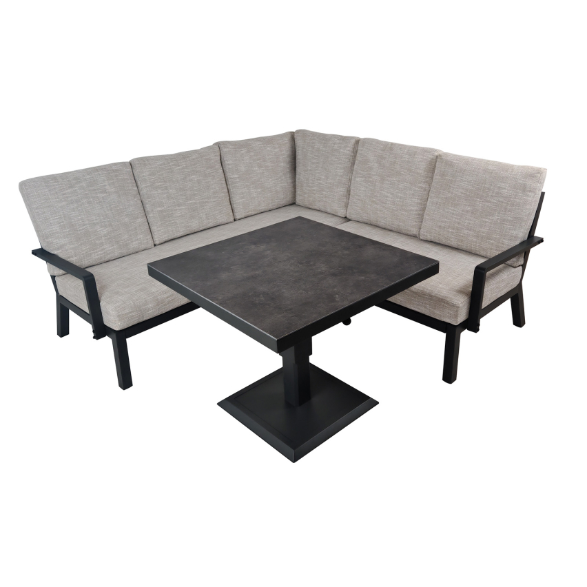 See mugav ja vastupidav aiamööbli nurgakomplekt CONRAD ühendab modernse alumiiniumraami, kvaliteetse kattekanga ja praktilise tõstetava laua. Komplekt sobib suurepäraselt terrassile või aeda, pakkudes nii lõõgastumiseks kui ka einestamiseks mugavat ja stiilset lahendust.