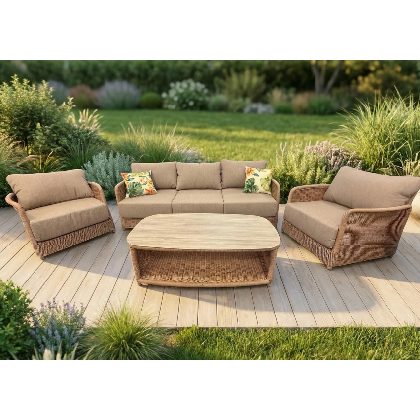 Aiamööblikomplekt CLIFF on hubane ja naturaalne valik terrassile, aeda või suvekoju. Punutud detailidega raam ja pehmed beežid padjad loovad kutsuva istumisala, kus on mõnus nautida suveõhtuid pere või sõpradega. Komplekti kuuluv kolmekohaline diivan, kaks tugitooli ja madal laud moodustavad tervikliku ja mugava puhkenurga.
