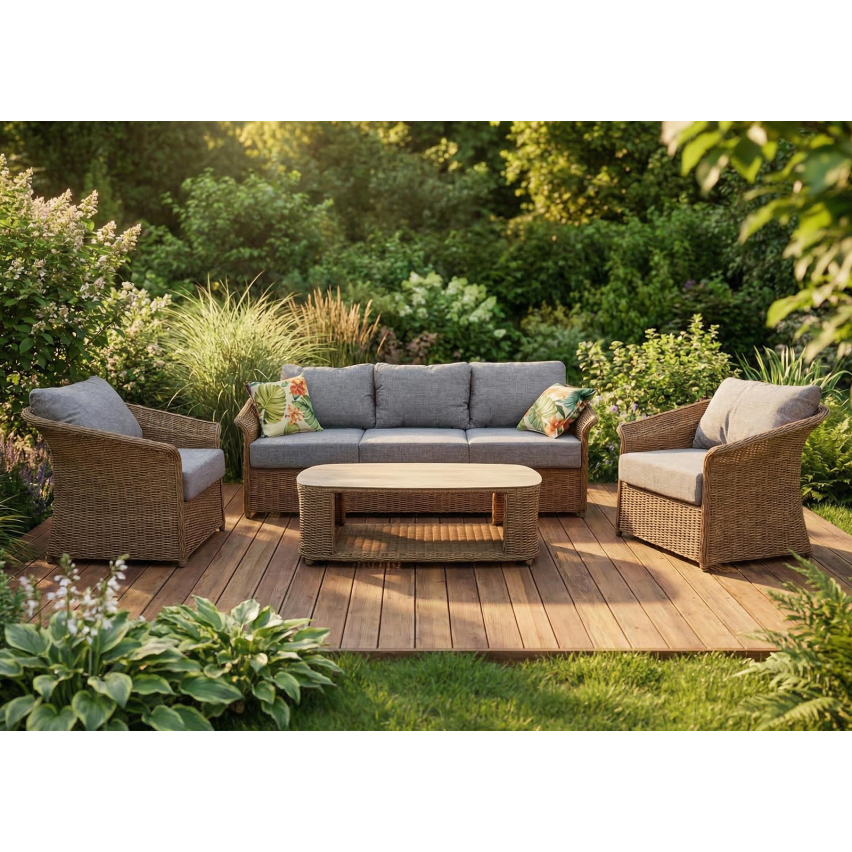 Aiamööblikomplekt DESERTO toob terrassile või aeda naturaalset soojust ja mugavat istumisruumi. Klassikalise punutisega raam ja pehmed beežid padjad loovad rahuliku ja ajatu ilme, mis sobib hästi nii modernsesse kui ka looduslähedasse õuekeskkonda. Kolmekohaline diivan, kaks tugitooli ja praktiline laud moodustavad tervikliku puhkeala, kus on mõnus nautida suvepäevi ja õhtuseid koosviibimisi.