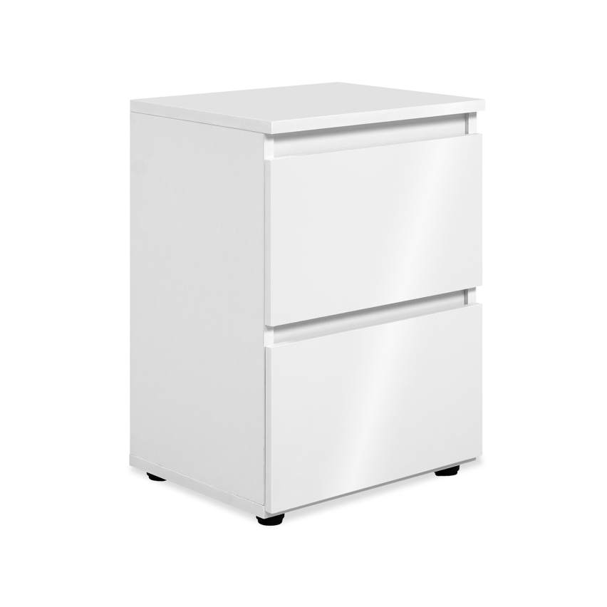 Öökapp LULEA mõjub minimalistliku ja selgena. Läikiv valge viimistlus ning käepidemeta sahtlid kaldu servaga loovad modernse ja korrastatud üldmulje, mis sobib ideaalselt heledasse ja kaasaegsesse magamistuppa.
