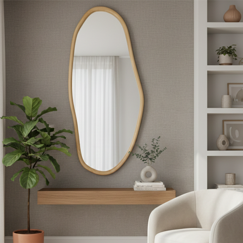 Orgaanilise ja voolava kujuga seinapeegel, mis pehmendab ruumi üldmuljet ja lisab interjöörile kaasaegset iseloomu. Asümmeetriline vorm mõjub loomulikult ning sobib hästi elutuppa, magamistuppa või esikusse.