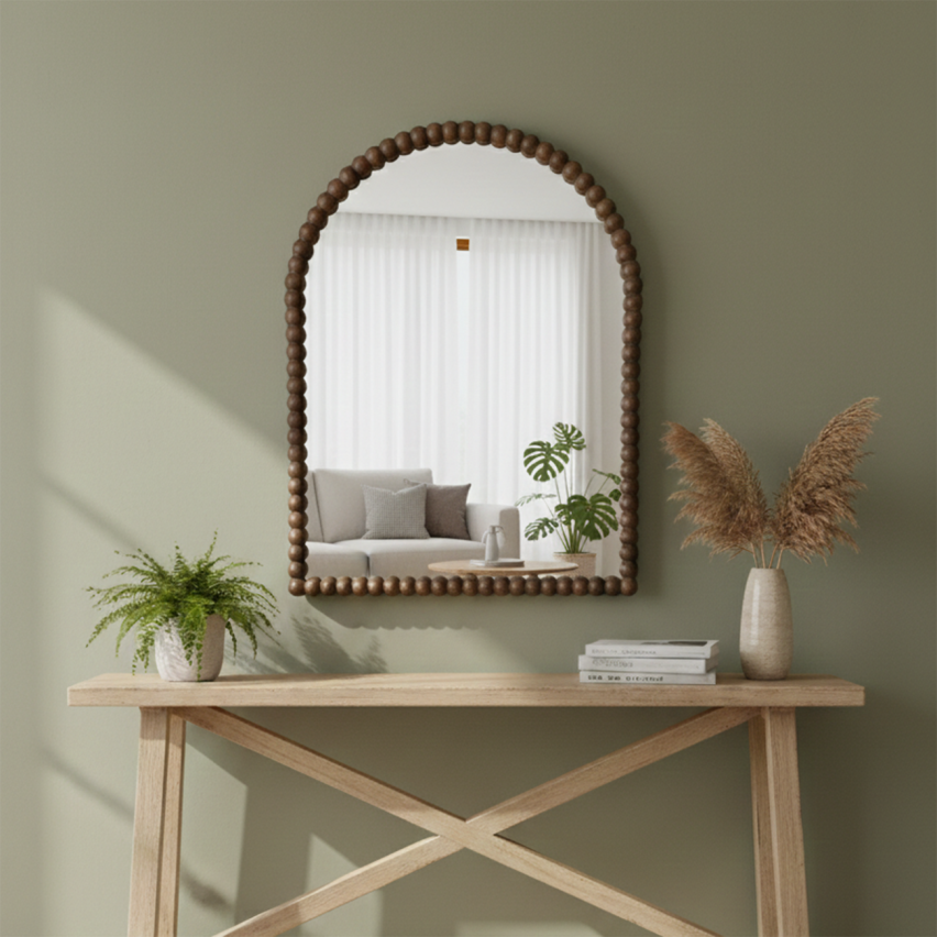 Kaarekujulise ülaosaga peegel MALIKA, mille dekoratiivne puitraam lisab interjöörile soojust ja isikupära. Pruun raam toob ruumi klassikalist ja looduslähedast tunnet ning sobib hästi esikusse, magamistuppa või elutuppa.