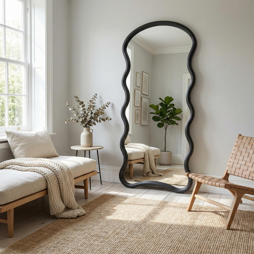 Voolava ja orgaanilise vormiga täiskõrguses seinapeegel, mis lisab ruumile pehmust ja isikupära. Laineline raam toob interjööri rahuliku, kuid pilkupüüdva aktsendi ning sobib hästi nii magamistuppa, esikusse kui ka elutuppa.