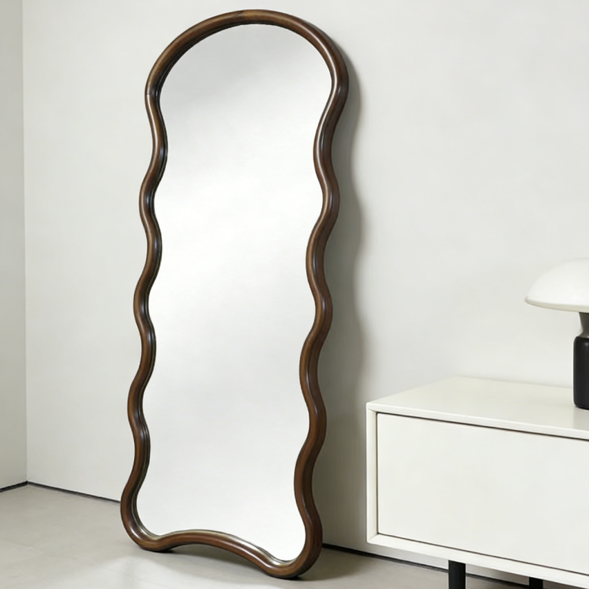 Voolava ja orgaanilise vormiga täiskõrguses seinapeegel, mis lisab ruumile pehmust ja isikupära. Laineline raam toob interjööri rahuliku, kuid pilkupüüdva aktsendi ning sobib hästi nii magamistuppa, esikusse kui ka elutuppa.