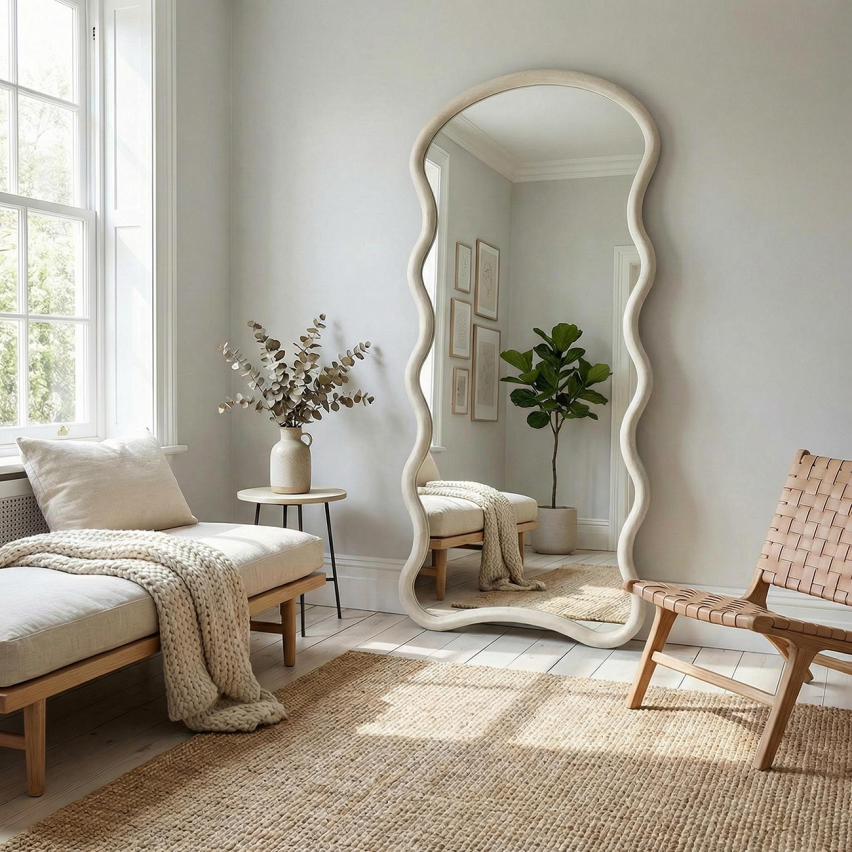 Voolava ja orgaanilise vormiga täiskõrguses seinapeegel, mis lisab ruumile pehmust ja isikupära. Laineline raam toob interjööri rahuliku, kuid pilkupüüdva aktsendi ning sobib hästi nii magamistuppa, esikusse kui ka elutuppa.