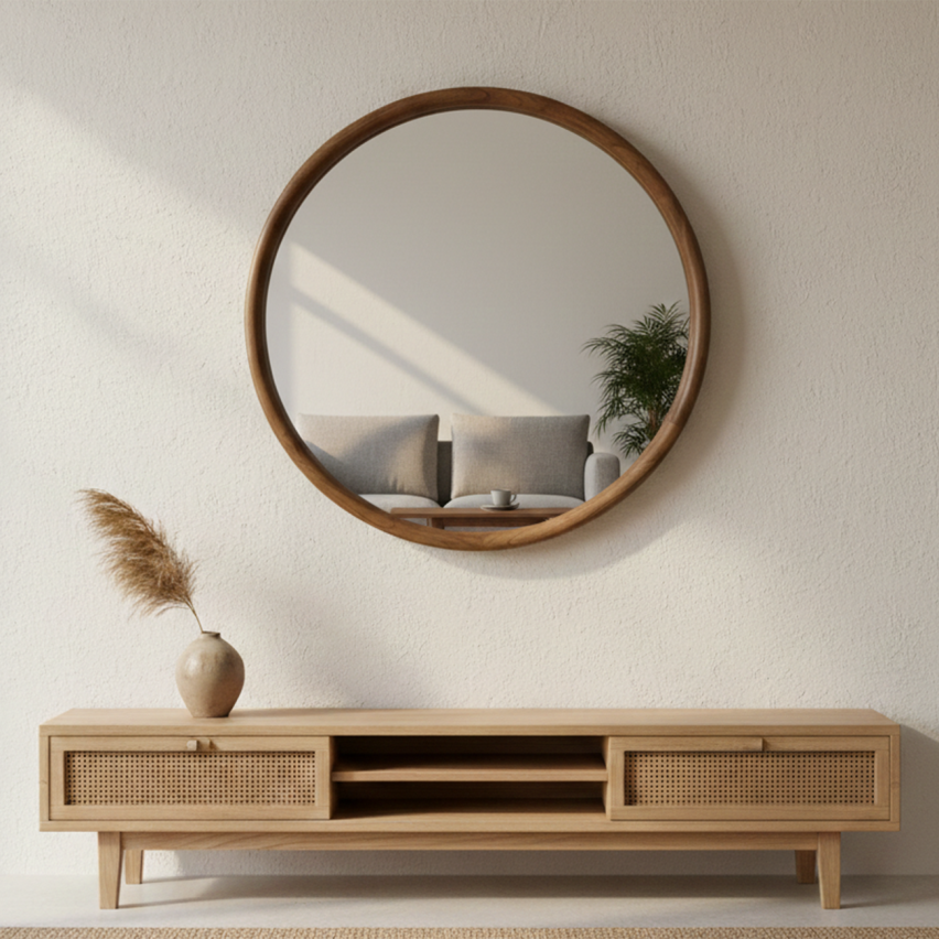 Ajatu ja tasakaalustatud disainiga ümmargune seinapeegel NARUTO, mis lisab ruumile soojust ja rahulikku iseloomu. Pruun puitraam loob loomuliku üldmulje ning sobib hästi nii esikusse, elutuppa kui ka magamistuppa.