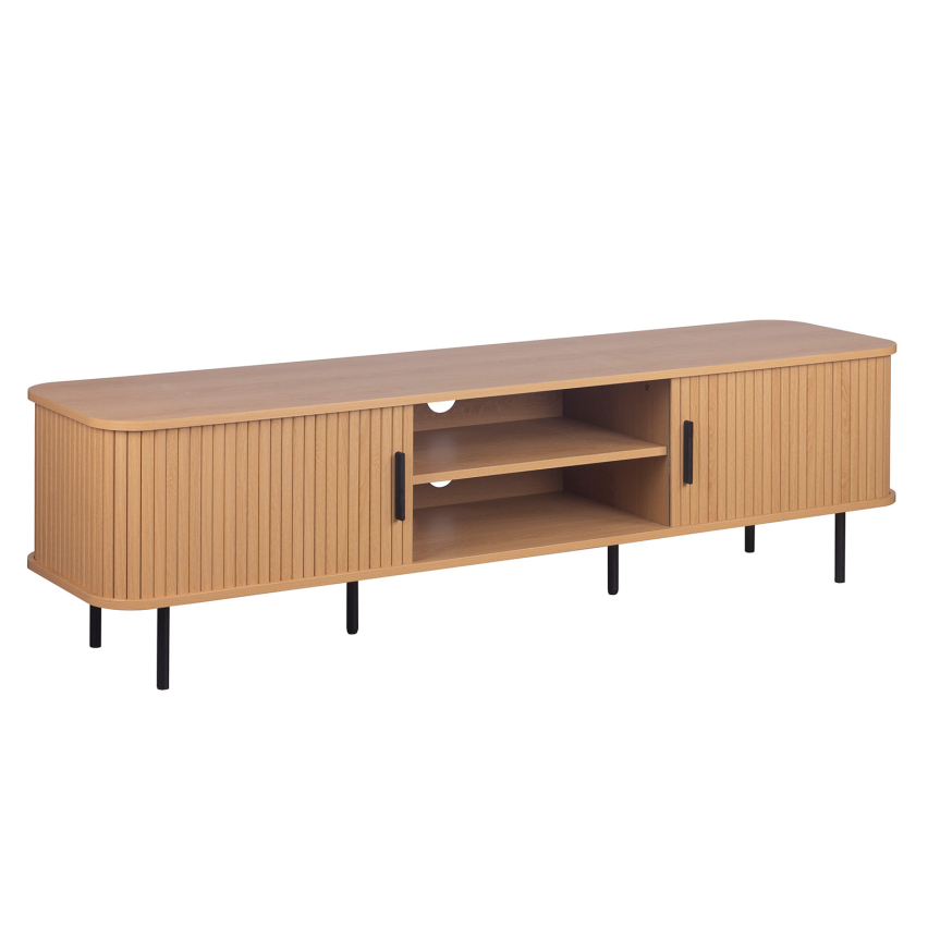 TV-laud KAJSA mõjub visuaalselt tasakaaluka ja õhulisena. Peened vertikaalsed jooned, pehmelt ümarad nurgad ja naturaalne puidutoon loovad rahuliku ning kaasaegse üldmulje, mida täiendab must metallraam.