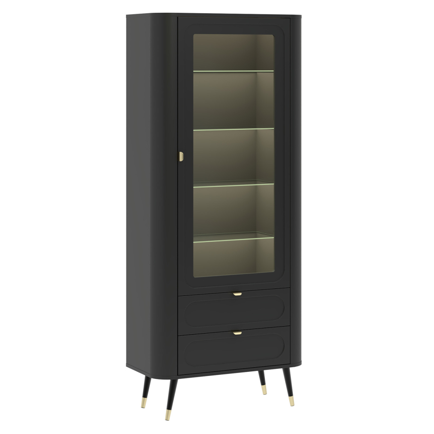 BLINX sarja vitriinkapp ühendab kaasaegse disaini, tumeda viimistluse ja peened kuldsed detailid. Kitsa ja kõrge vormiga vitriin sobib suurepäraselt nii elutuppa kui söögituppa. Klaasuks ja sisseehitatud LED-valgustus loovad õhulise ja luksusliku mulje. Kapi alumises osas asuvad kaks mugavat sahtlit, mis pakuvad lisaruumi väiksemate esemete hoiustamiseks. Kõrged metalljalad annavad mööblile kerguse ning muudavad puhastamise lihtsaks.